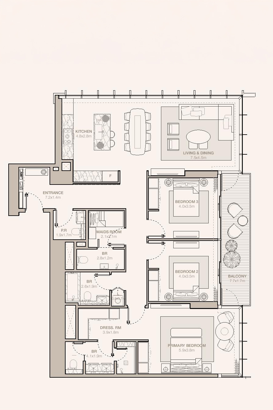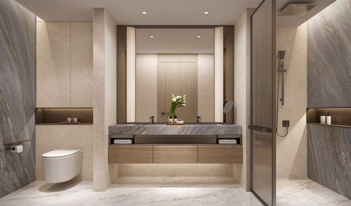 The 3-bedroom residences speak to a life of elevated sophistication, designed for those who value expansive space and commanding perspectives. These homes are defined by soaring double-height ceilings in the living and kitchen areas, wrapped in floor-to-ceiling glass that captures uninterrupted, panoramic views of the city skyline. The layout is crafted for both grandeur and privacy. The master bedroom serves as a personal sanctuary, featuring a walk-in closet, a spacious private balcony, and an elegant en-suite bathroom accented with timeless fixtures and natural textures. From the grand entertaining spaces to the quiet retreat of the bedrooms, every detail invites rest, restoration, and refined living.