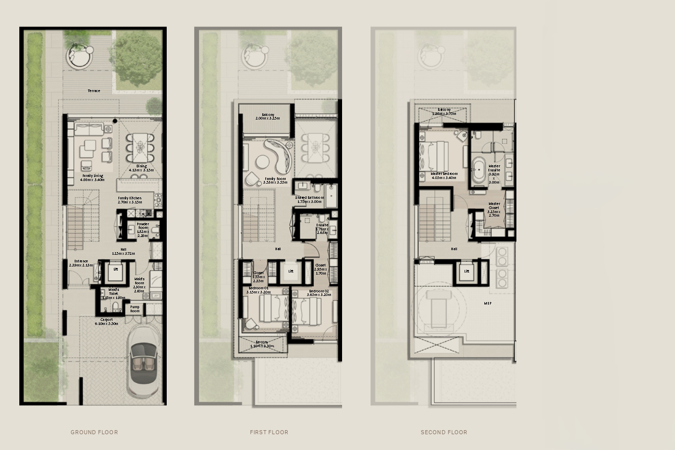 The master bedroom includes built-in wardrobes and a well-appointed en-suite bathroom, while the additional bedrooms are generously sized and versatile, ideal for family members, guests, or a home office. Private outdoor spaces and landscaped surroundings add to the overall sense of comfort and connection with nature.