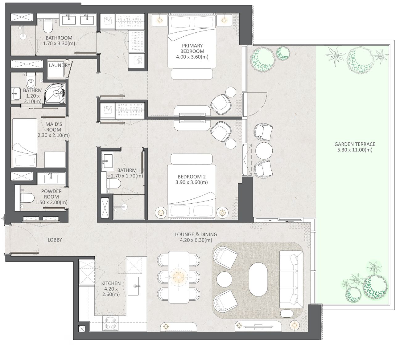 The two-bedroom apartments with maid’s room at Naya Residences are designed to offer enhanced space and flexibility within a refined lagoon-front setting. Open-plan living and dining areas flow seamlessly onto a private balcony, creating bright, airy interiors ideal for everyday comfort and relaxed entertaining, with views over the crystal lagoon or landscaped greenery. Floor-to-ceiling windows invite abundant natural light into the home, strengthening the connection between indoor living and the surrounding waterfront environment. The two generously proportioned bedrooms provide privacy and tranquility, while the additional maid’s room adds practical versatility for families or those seeking extra service space. With modern kitchens, refined finishes, and thoughtfully planned layouts, these residences combine functionality with understated elegance. The 2-bedroom + maid’s room homes at Naya Residences offer a premium lifestyle within one of Dubai’s most prestigious lagoon-front communities in District One.