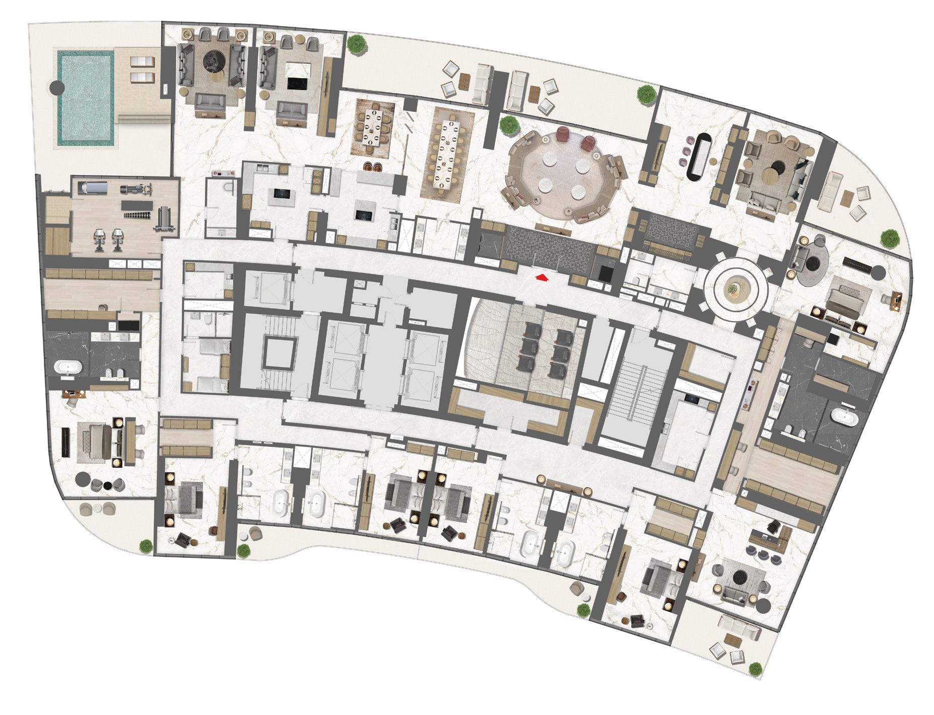 The six bedrooms are designed as private luxury suites, including an opulent master suite with walk-in wardrobes and a spa-inspired en-suite bathroom. Each additional bedroom offers generous proportions, refined finishes, and serene views, ensuring the utmost comfort for family members and guests. Selected layouts may include dedicated maid’s and driver’s rooms, private lift access, and exclusive entrance foyers, enhancing privacy, prestige, and convenience.