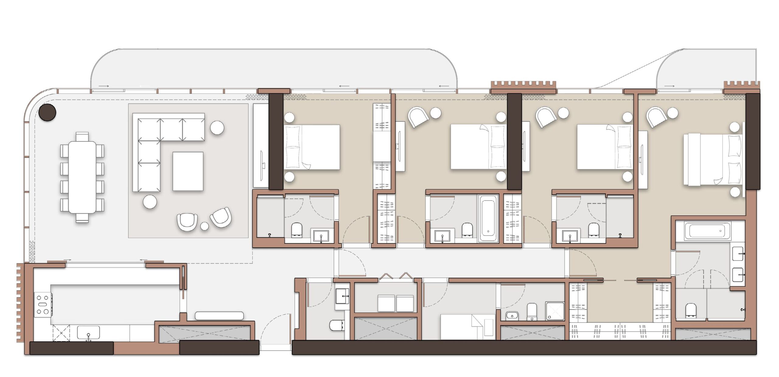 Floor-to-ceiling panoramic windows frame breathtaking views of the waterfront and Dubai skyline, bathing the interiors in natural light and enhancing the sense of space, serenity, and connection to the surrounding landscape. The four generously sized bedrooms are designed as private sanctuaries, featuring custom-built wardrobes, refined materials, and a calm, balanced aesthetic that elevates everyday comfort and well-being.